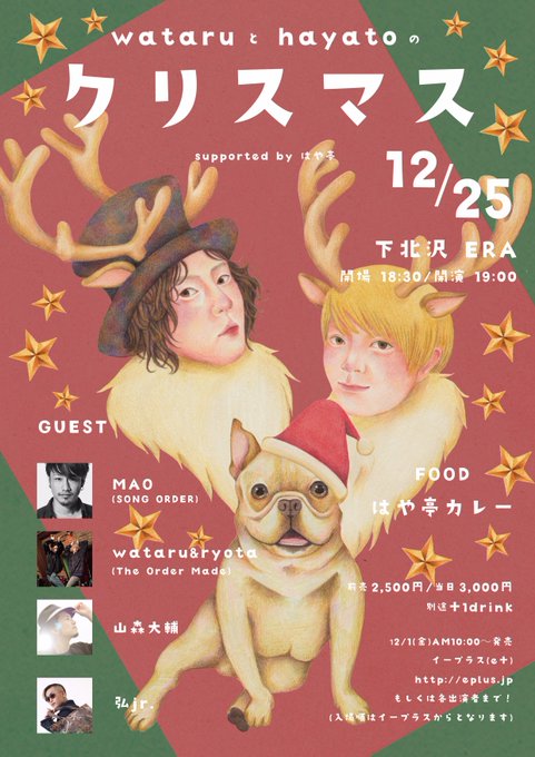 『wataruとhayatoのクリスマス』フライヤーイラスト描かせて頂きました! 最近あんまり人物描いてなかったからめちゃめちゃ楽しかった〜! はやとさん企画のライブは間違いなく素敵なので、音楽好きな方はぜひチェックしてみて下さい^^