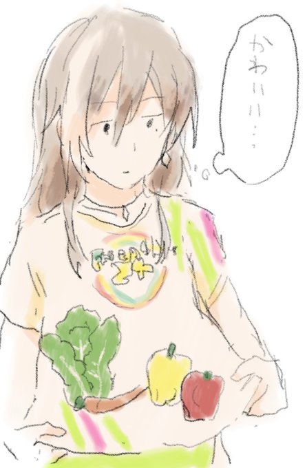 「ねえ。なんで僕のTシャツだけリアルな野菜イラストなの?」 (だから野菜はやめましょうって言ったのに…) (おい誰か説明しろよ…) (あの顔絶対怒ってんな…) (不満そう) (デザイン気に入ってもらえなかったかな…) (露骨なベジタリアンアピールしてしまいました…) (俺は似合ってると思うけどな~)