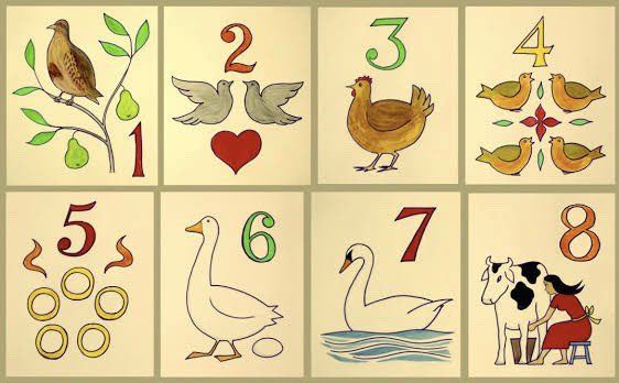 On the fourth day of Christmas my true love sent to me. Four calling birds Three french hens Two turtle doves, and A partridge in a pear tree.