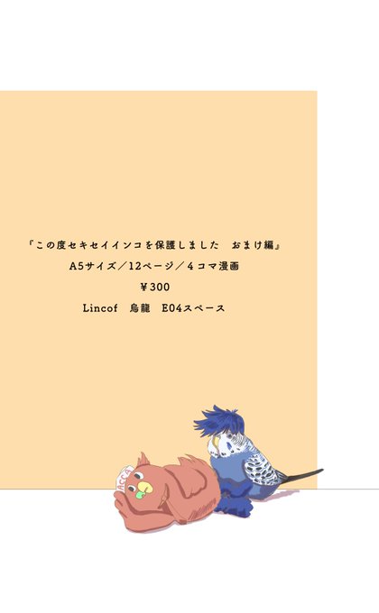 【告知】明日12月17日の赤D3に参加します。『この度セキセイインコを保護しました』のおまけ本サンプルになります。また既刊も持っていきます。お手にとっていただけますと幸いです。