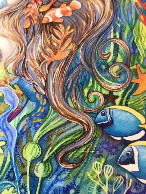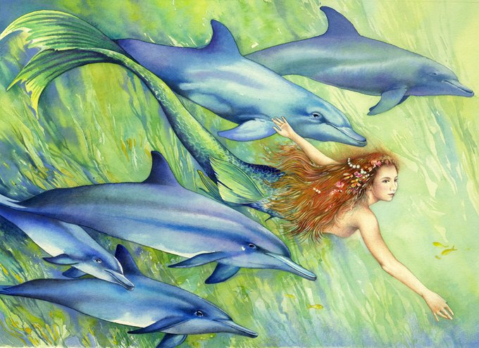 April's illustration for the Shed calendar a collaboration between myself and @Joannechocolat. Read more about it https://t.co/CPYggAONOy #watercolour #illustration #amwritingfantasy #bookartist #kidslit #mermaid #dolphin