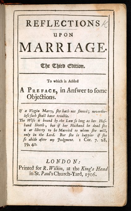 Mary Astell (1666-1731) was a writer and early advocator for women's rights (esp. education). This is her book about the inequalities of marriage.