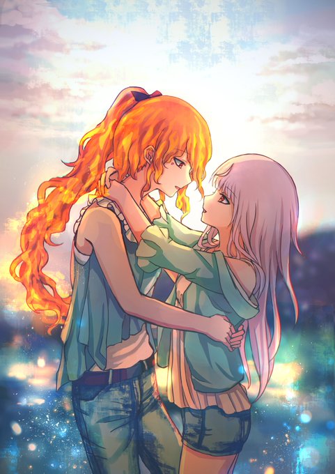 之前個人帳徵的構圖XD 構圖內容:頭扣頭、手扣手相視而笑,夏裝 氣氛:雨過天青