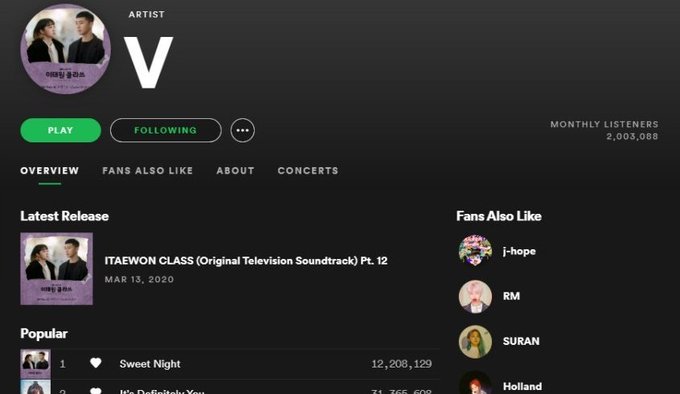 Sweet Night is currently the 3rd most popular song among listeners around the world & Taehyung the 18th Most promising performers on the Last FM