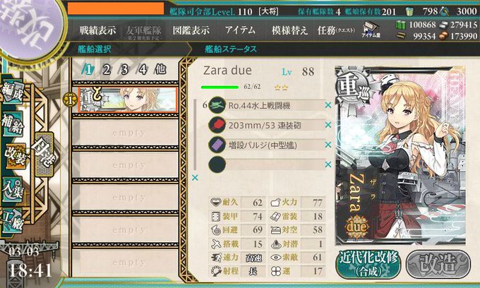 遅ればせながらZara dueに改造完了。雷装が低くて二度見した。