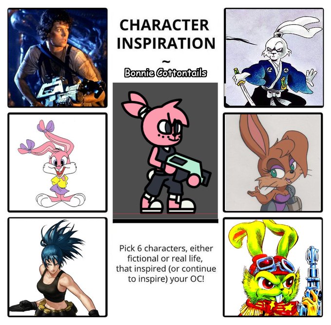 Freedom Fighters from SATAM made me love concept of cute anthros fighting evil, Bucky made me want characters with guns, Usagi made me choose a bunny species, Leona is outfit, Babs Bunny is fur color, Ripley is the gun and overall strong woman inspiration.