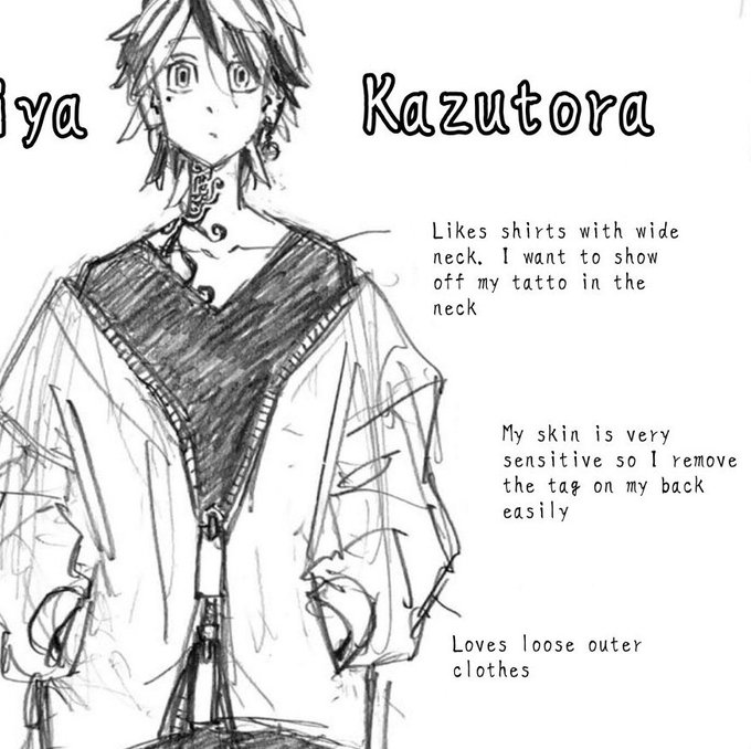 This official art took into account Kazutora's canonical information. Like that he likes gangsta goods. The baggy clothes and the uncovered neck to show his tattoo.