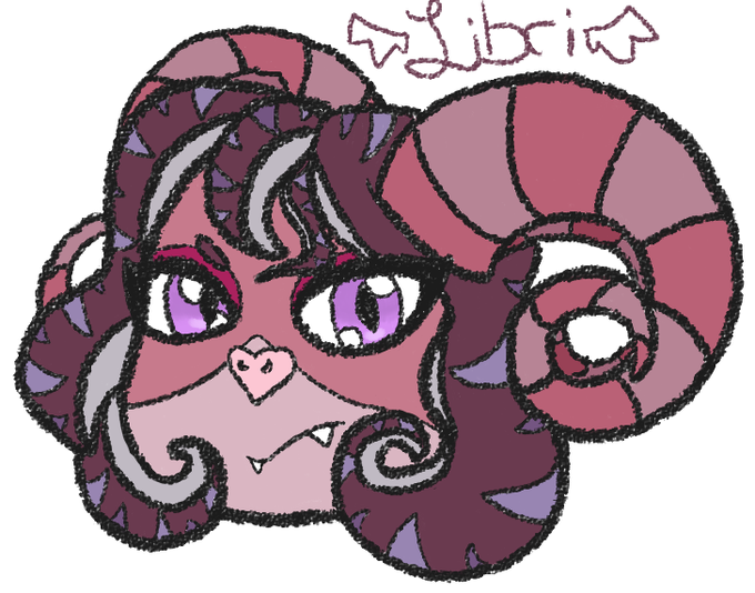 This is Libri! His name comes from 'Equilibrium', goes by He/They! Ram horns, tenta-hair, and a cute lil bat nose because why not 💙