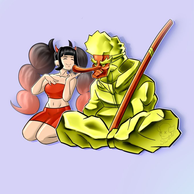 Red and Bean, REDBEAN. Gave Red a redesign the otherday (literall slapped a tengu mask on him also added piercings) Mans had a whole timeskip off screen