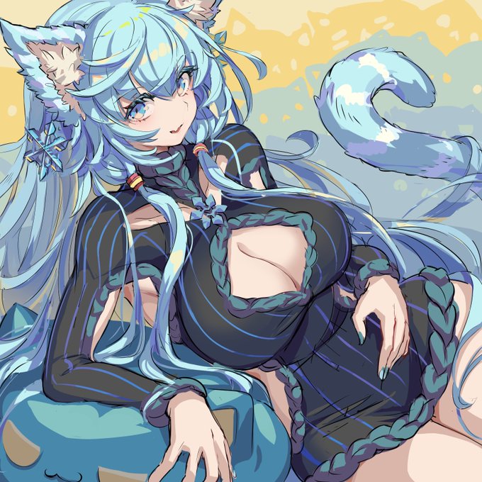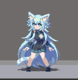 名前:ユキメ 種族:スノウキャット(雪猫) 極寒の地域に住んでいる雪猫族の女性 マイペースな性格で食べることが好き 暑い所が苦手で汗っかきのため 隙間の空いた独特な蒸れ防止用の服を着ている 氷の大弓や氷の双剣を生成して戦う #ドット #pixelart