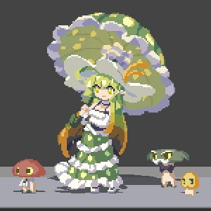 名前:ニノン 種族:ブリアントファンガス 光り輝く大変珍しい種のマタンゴ族の女の子 のほほんとしつつもどこか天真爛漫な性格 自身の髪の毛も少し発光しているため、 夜間になると目立つため、少し気にしている 戦いの際はサポートやヒーラーとして活躍する #ドット #pixelart