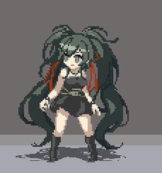 名前:名はまだ無い 種族:ヒューマン…? 虹の光の槍を召喚して戦う女性 赤のリボンは止血用の紐…らしい #ドット #pixelart