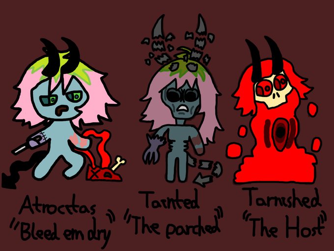 Decided to draw my OC Atrocitas as a Binding of Issac character with her tainted version and her tarnished version which is based on the Epiphany mod
