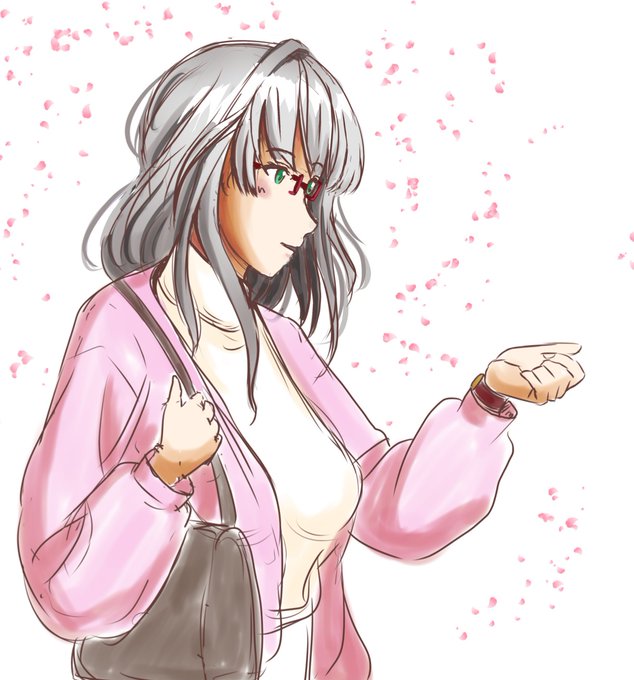 桜の舞う中で待ち合わせ…といった感じで、出勤前に30分程使って描いてみました。