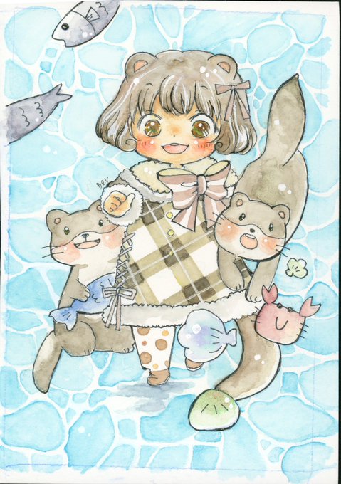 水彩で動物と子供たちを描いています