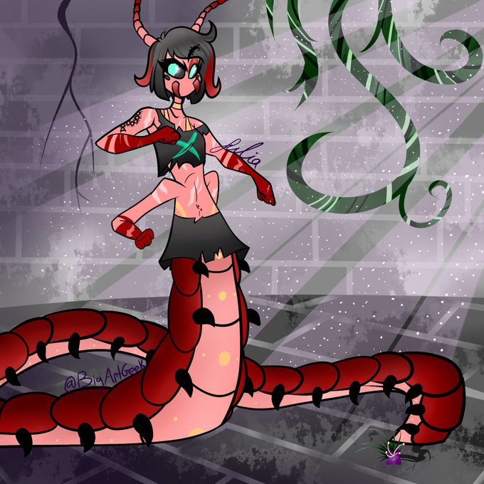 I made a centipede gorl named Crossfire and I've finally had time to draw her 🙏🙏🙏 and I love her sm. I also decided to start practicing backgrounds more and I feel this is a pretty good start. #artistsontwitter #art