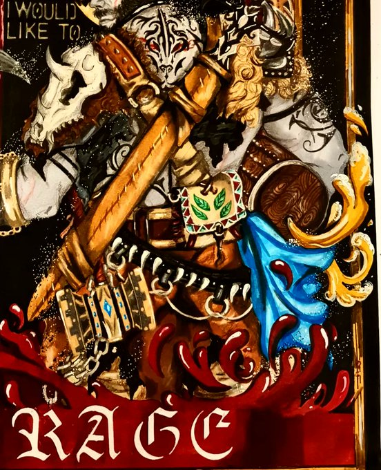We have grog with his magical weapons and items, (I have taken some artistic liberty on the designs) his bear tatto after his victorious fight against his uncle, his many accessories, a keg of strongjaw ale, a very special blue scarf from his best little buddy