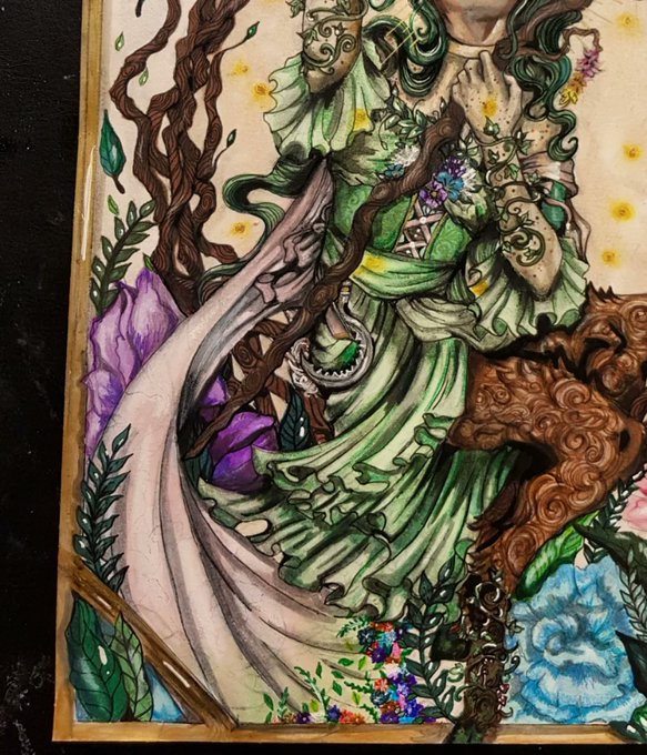 I felt like I really wanted to illustrate her connection with nature and the lovely chaos in this character by mixing lots of soft colors, flowers, fireflies, patterns etc and then show the more dangerous, reckless side of her by having her burning the upper corner of the drawing