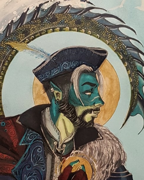 To capture the feeling of that Yasha is a fallen aasimar, I decided to draw out the dark and skeletal wings and surround her with white feathers floating on top of the water.