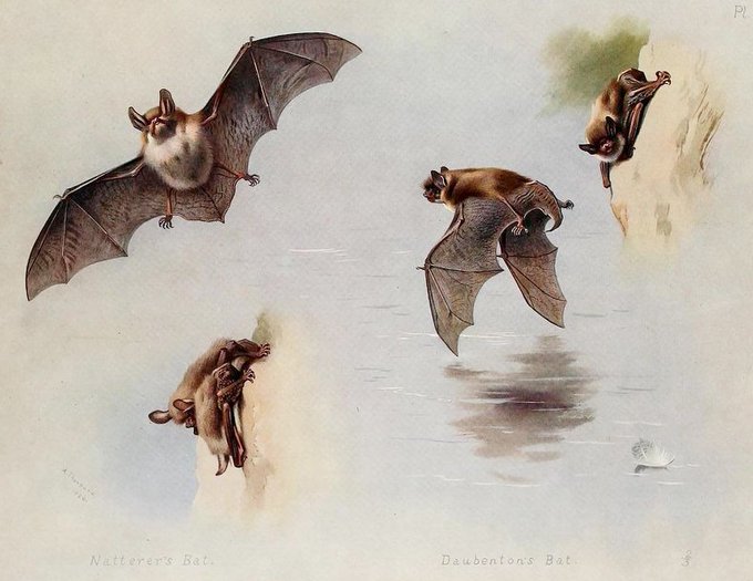 Bats are the only mammals naturally capable of true, sustained flight. Bats on the wing by Archibald Thorburn from his "British Mammals" v. 1 (1920). Check it out for free in #BHLib thanks to @FieldMuseum ➡️ https://t.co/liXT09MrcJ #lovebats