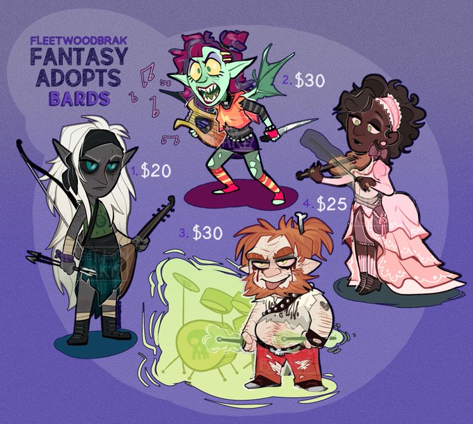 Some bard adopts for your fantasy needs! 🥁🎻🎶 Varying prices for these ones via paypal only please, & please read TOS before purchase: https://t.co/N8gBYJApuX Comment or DM me to claim :) You can also stay up to date with my adoptables here: https://t.co/FdTuv9zY1s