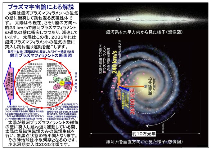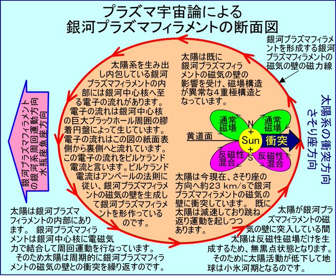 今太陽系は銀河中心核に向かって流れるビルケランド電流によって生じたビルケランド磁場の磁気の壁に衝突して跳ね返りつつあるのです。