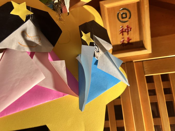 七夕🎋ですね。子供達の作った折り紙と笹を供えてあります。