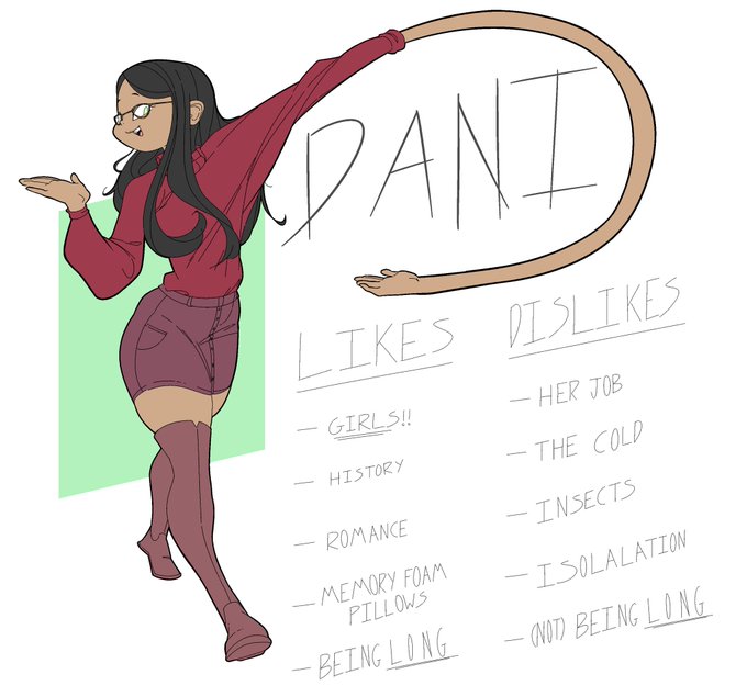 This is Dani! She’s been in Alice’s sleepy little town her entire life, where she works at a dinky little museum! After an incident at said museum, she eventually gained the ability to stretch her newly-elasticized body, an activity she very, VERY, hornily relishes in.