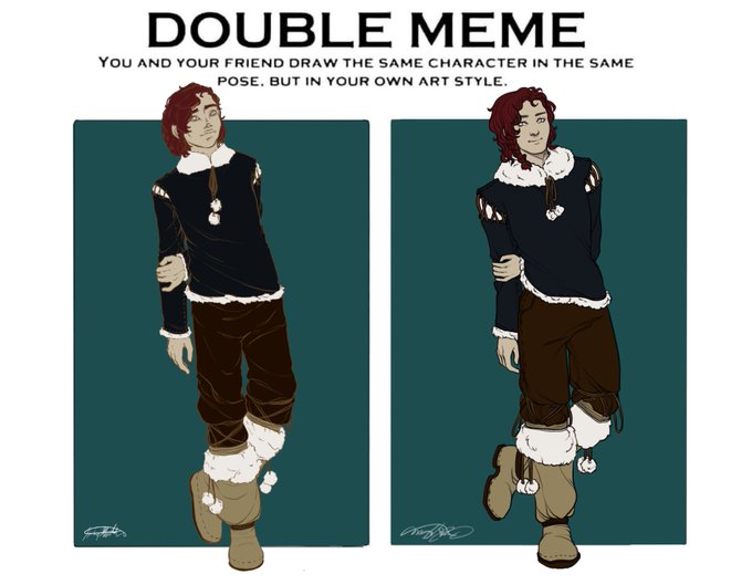 Did this challenge twice with my best friend @CorruptedPage97 The first one is my character and the second is hers. Mine is on the left first and the right next. #art #ArtistOnTwitter #digitalart #procreate #procreateart #doublememe #doublememechallenge #ocs