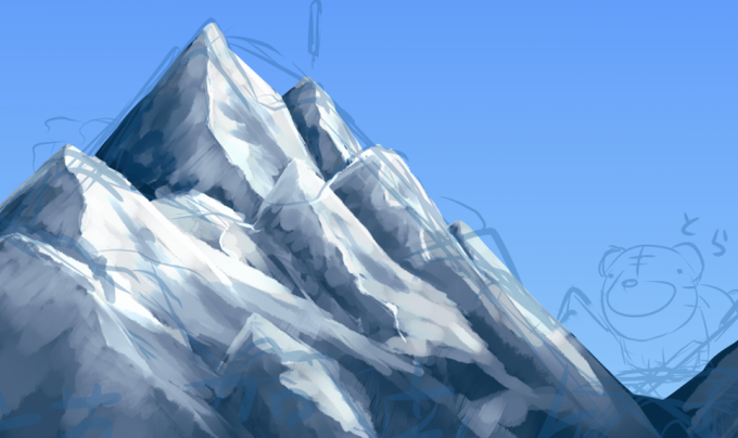 山描くの楽しい!山描くの楽しい!(キャラの方はまるで進まねぇ!) ドラゴンスパインのつもりだけど現物をまるで見ずに脊髄だけで描いているから多分あとあと困ると思う