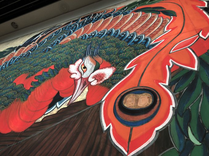 墨の輪郭は重ね塗りで厚みが出ることで光を反射して銀にも白にも見え、鳳凰の表情を柔らかくしていたという。(金箔は想定の再現) #Bura_Bi_Now