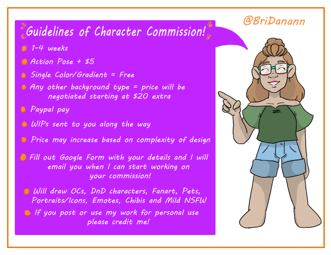 I also have commissions open at the moment! Do you want a character created? Or an emote? Or maybe a poster? I am your gal!