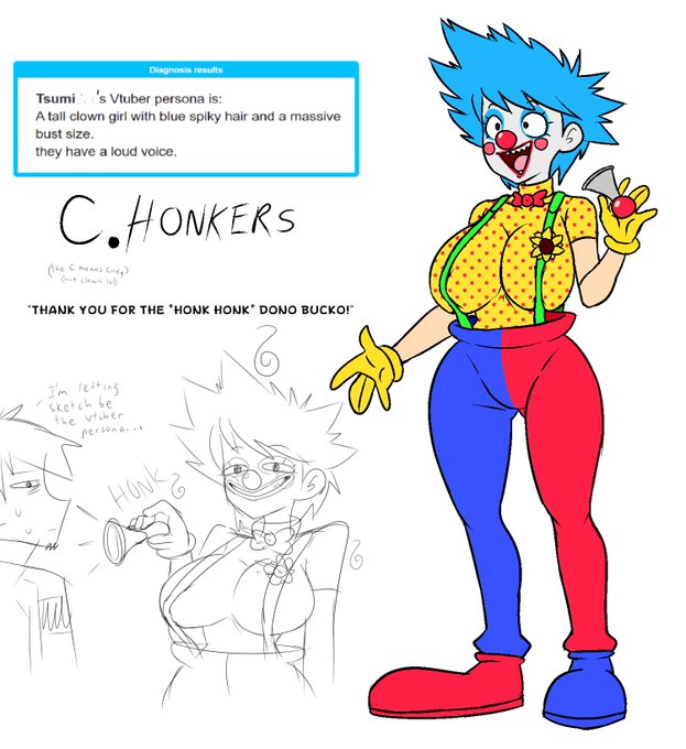Created from some... vtuber generator, Cindy Honkers is a clown vtuber that REEEAALLLY loves hotdogs.