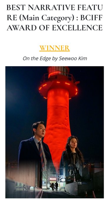Yes it is. Second award for the film!! 👏🏻👏🏻 Best Narrative Feature (Main Category): BCIFF Award of Excellence WINNER: ON THE EDGE by Seewoo Kim 🎉🎉 https://t.co/pNr95je4TY #BCIFF #OntheEdge #ParkYuchun #Yoochun #박유천 #ユチョン