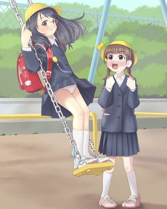 左がピクシブにずいぶん前に上げた絵。右がその色違い。こちらは実際の登下校に使われている冬服通学帽の色(紺色)になっている点や、昨今人気のパステルカラーのランドセルになっているなどの差異があります。