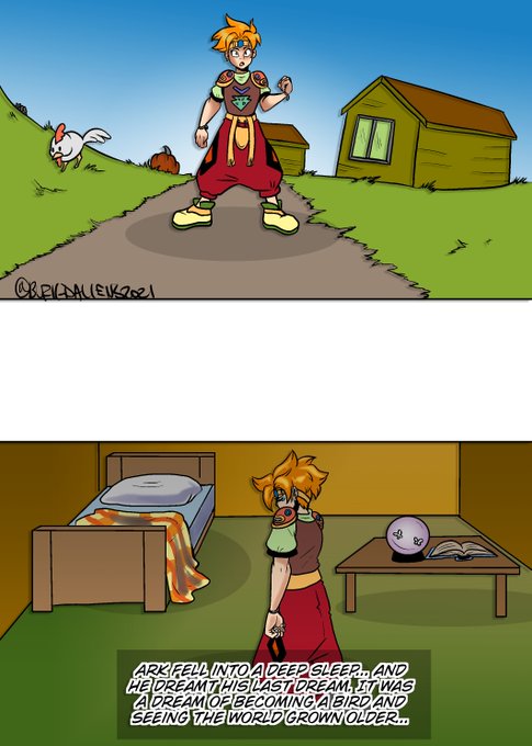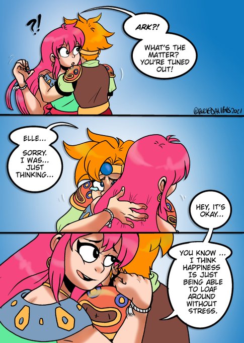 So sad I won't be able to go see the #tenchisozo #天地創造 art this week since I'm on the other side of the world, but here's an old comic I did of Ark & Elle from the final moments of the game 💖 (1/2 thread)