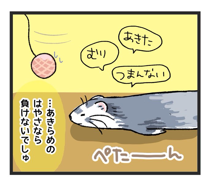 フェレットまんが019「負けないもの」 しつこさと執念に定評のあるいたちですが、突然の戦意喪失に飼い主はいつも置いてきぼり。 Nobody cannot defeat to give up halfway. :3 #ferret #フェレットの日常まんが #フェレット