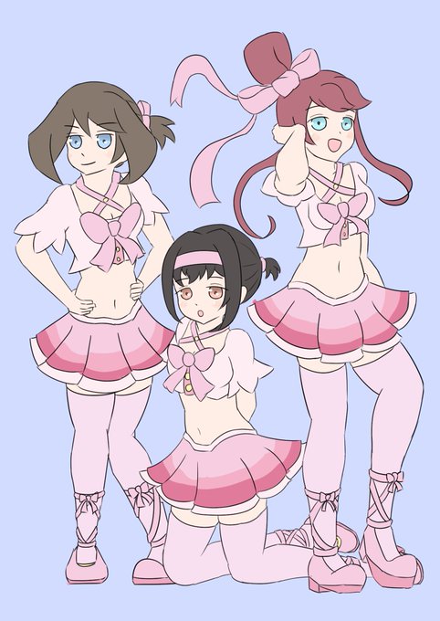 お題箱より「ポケモンのエリカ、ハルカとフウロのアイドル服、ニーソを履くます。全身絵がお願いします。」 ORASのコンテスト衣装っぽい何かを着せました~