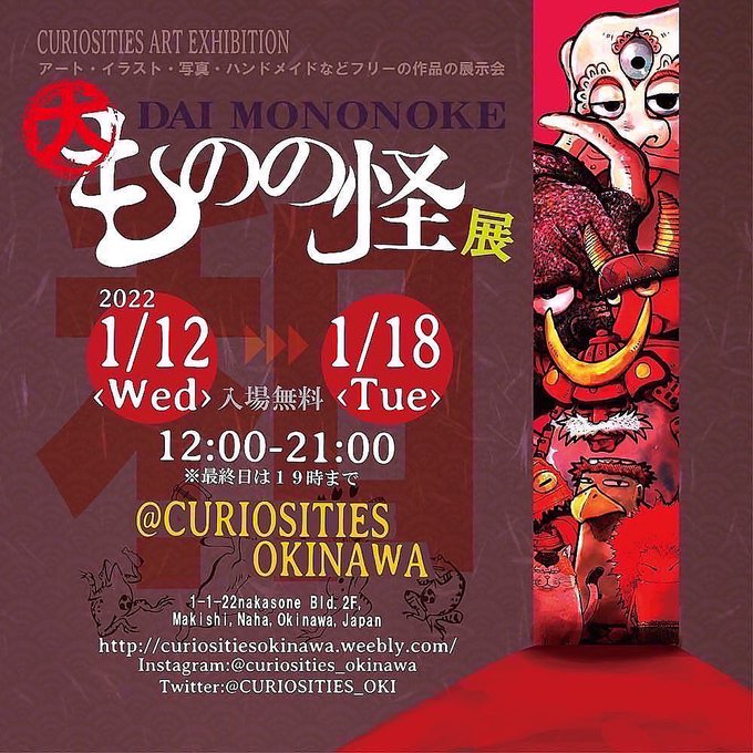 【出展者大募集】 2022年最初企画展のテーマは「大ものの怪展」! 和を感じる怪しげな雰囲気、もののけの気配を感じる路地、怖い妖怪から可愛いモノノ怪ガールまで作家さんの自由な発想で「もののけ」作品を大募集。 詳しくはHPまでチェックしてくだい!☆ #展示会 #沖縄 #ギャラリー #大ものの怪展