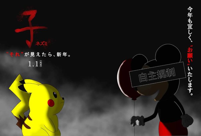 ツイステのミッ○ーの恐怖の話をしてて「そういやこんなん描いてたわ」と思い出した1枚。 年賀状です。itのパロディ……。