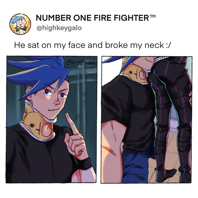 Promare au where everything is still the same except when galo was pointed at his face by lio’s sword we see him instinctively (???) spread his legs wider.