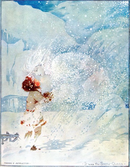 Here are four illustrations from my favourite fairytale, The Snow Queen. The protagonist is a young girl named Gerda, who battles her way through adventures to save her friend Kai from the evil Snow Queen.