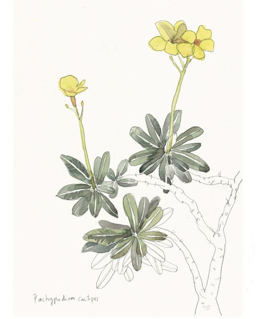 Pachypodium cactipes, is the name of this African bush that I have sketched in Summer, while visiting the greenhouse in #Palmengarten. The print is now available in my etsy shop! A bit of tropic for the grey Winter time 🌞