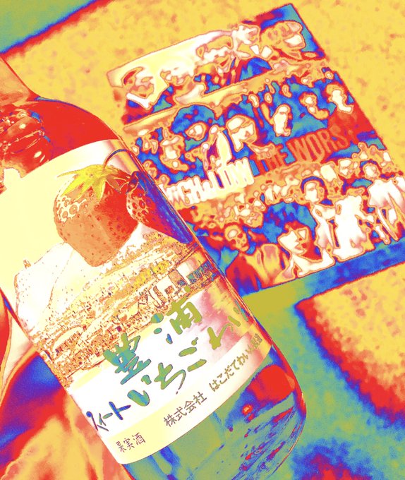 幸せを噛み締めて、いちごワイン♥️🍓🍷 ボヤけてサーモグラフィー風になってもドロッキーの小首傾げるのはかわちいね