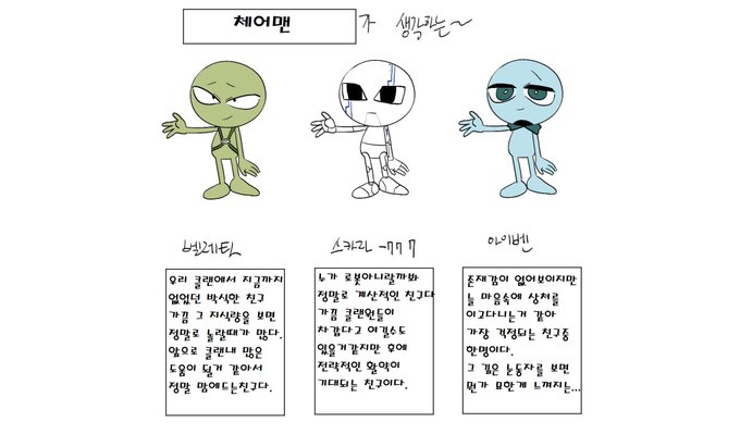 원탁의 의자가 뭐하는 클랜인지,클랜멤버는 누구인지 궁금해하시는분들을 위해 이곳에 각자 캐릭터 이름과 간단소개,각종 그림들을 답글로 올립시다.