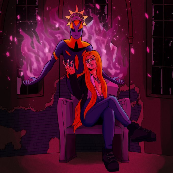 A drawing of a Jojo oc based on my significant other with their stand, Angel On Fire!