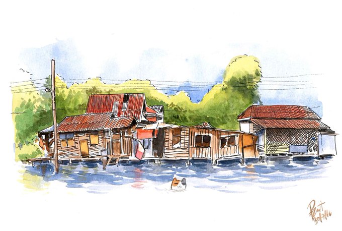บ้านริมคลอง, กรุงเทพ #bangkok #watercolor #painting #cat