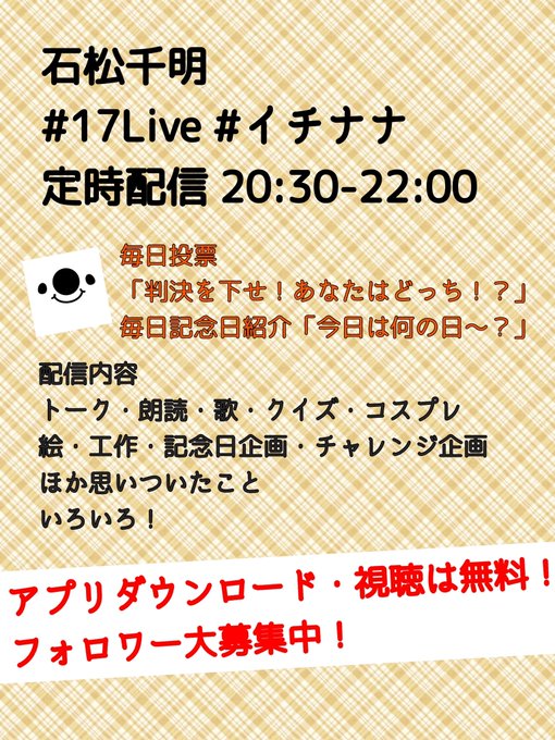 本日の #17Live 配信は20:30-22:00