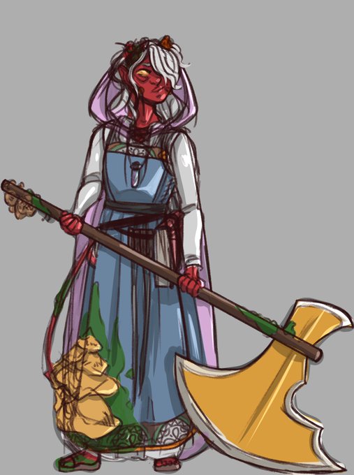 This is Ichiko, she's a thirteen-year-old tiefling and my newest character!! She's a wild magic barbarian/circle of spores druid multi-class, she escaped the feywild a few years ago after being thrown into it at the age of eight and is readjusting to society. 🥺