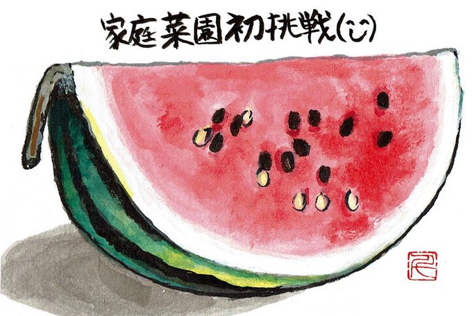 #絵手紙 #ハガキ絵 #家庭菜園 初めて挑戦した西瓜です。最初の2個はしたたかなカラスにやられてしまいました。やっと3個目の西瓜が食べられました。 必死にカラスから守った西瓜は、格別に美味しい。